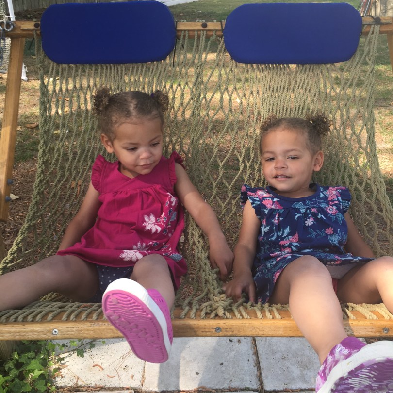 Because we’ve been out in the sun so much, their hair has gotten really blond on the ends and it looks like they have a golden halo around their heads.  There are some days when that is the only angelic thing about them as they have definitely embraced being 2.  They’ve been going through a phase where they don’t want to wear clothes or diapers but are not interested in using a potty yet.  It is not my favorite phase.  Taya has been known to dig in her diaper and paint with it like poo-casso.  The other day I put them down for their nap and heard evil laughter and poked my head in.  Emi had pulled her freshly pooped in diaper out from her romper by going through the leg hole. They were tossing it back and forth from crib to crib like a volleyball.  I could have died.  I’m good with blood and guts but poop is not my thing.  They have also figured out that they can reach the sink by pushing up a kitchen chair and I came out of the shower last week to them having sprayed the kitchen floor with an inch of water and running through the puddles.  Needless to say, diapers are now reinforced with packaging tape (they could peel off duct tape) and all the chairs are turned upside down on the table when not in use.  I’ve also started showering during nap time.  Their naughtiest achievement came in July.  We celebrate the official day of their adoption and call it “Family Day”.  We were wrapping up the day at an ice cream store.  Emi decided that we hadn’t celebrated with enough fanfare so she pulled the fire alarm as we were leaving.  Lights and sirens we blaring.  Thankfully it scared the crap out of her so I don’t think she’ll be doing that again.  We also found a new ice cream store to go to.